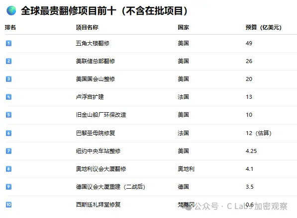 还指出美联储总部(Eccles 大楼)在 1999–2003 年已做过全面翻修,现在再花这么多钱太浪费了。可能很多人对美联储花 26 亿美元装修没有概念。要知道这个支出在全世界可以排第二,只有五角大楼比他贵!