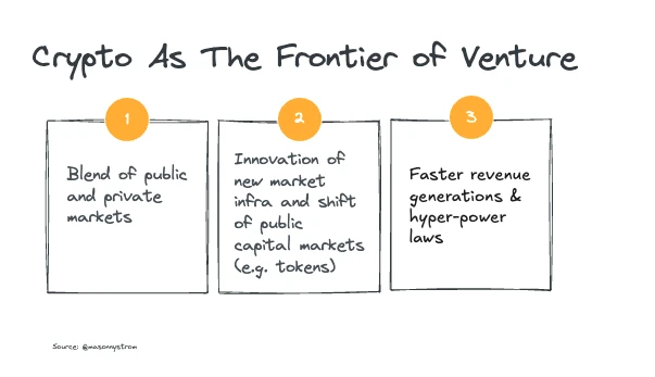 风投正朝着公募与私募资本市场融合的方向发展,越来越多的传统风投基金选择参与流动性市场(如 IPO 后持仓工具)或二级市场投资,因为企业普遍推迟上市。加密正处于这场变革的最前线。