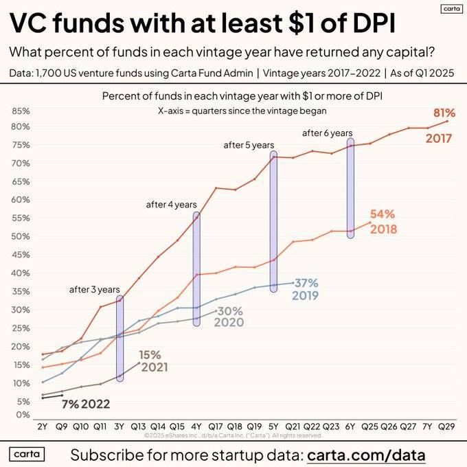 话说在前:融资环境艰难,因为上游 DPI(深潮注:按市值加权的指数,用于追踪去中心化金融 (DeFi) 资产在加密货币市场中的表现)和 LP 的资金挑战,纵观整个 VC 领域,基金在相同时间段内向 LP 返还的资金与以往相比有所减少。