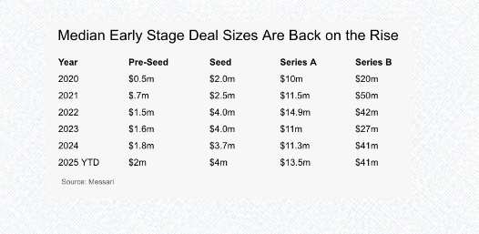 Pre-seed 融资规模持续同比增长,表明市场在早期阶段仍拥有充足的资金。种子轮、A 轮和 B 轮融资中位数已接近或回升至 2022 年的水平。