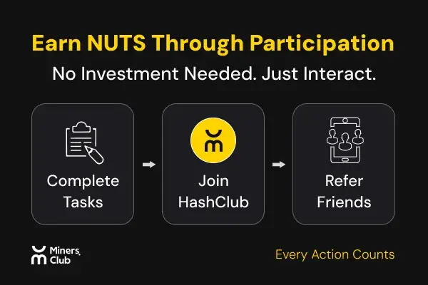 进入MinersClub App中的「Tap-to-Earn」任务系统,完成签到、转发、社交任务即可获取NUTS, 0成本,0收入 。