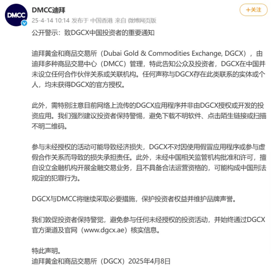 后续,多地主体与监管方对这一平台进行了风险提示。今年1月,宜宾市叙州区财政局发布风险提示指出“DGCX鑫慷嘉”打着DGCX旗号,开展网络投资活动,建议投资者远离类似平台。