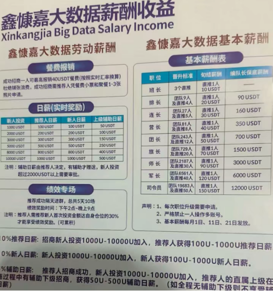 高端的营销地址、简单的操作方式、高额的本金收益,已然是针对人性的考验,层级分明的军团拉人制,则更是为平台扩张奠定坚实基础。据悉,鑫慷嘉主要通过线下聚会以及微信建群的方式发展会员制下线,每位新人投资者需缴纳最低1000USDT的入门费,值得注意的是,级别与收益也有直接关系,例如最高级别“司令员”直推一人可获得150枚USDT奖励,最低级别的“班长”直推一人则奖励10枚USDT,从收益来看,高级别职务推荐奖金与月薪可达到上万美元。