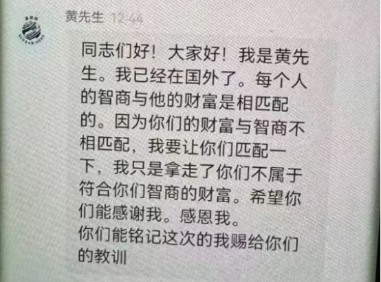 美梦终究会醒,日赚斗金的泡沫也只会破灭。今年6月25日,鑫慷嘉平台突然暂停提现,随后黄先生发在社群里的一段话,更是彻底击碎了投资者的幻想。“ 同志们好!大家好!我是黄先生。我已经在国外了。每个人的智商与他们的财富是相匹配的。因为你们的财富与智商不相匹配,我要让你们匹配一下,我只是拿走了不属于符合你们智商的财富,希望你们能感谢我。感恩我。铭记这次的我赐给你们的教训。 ”