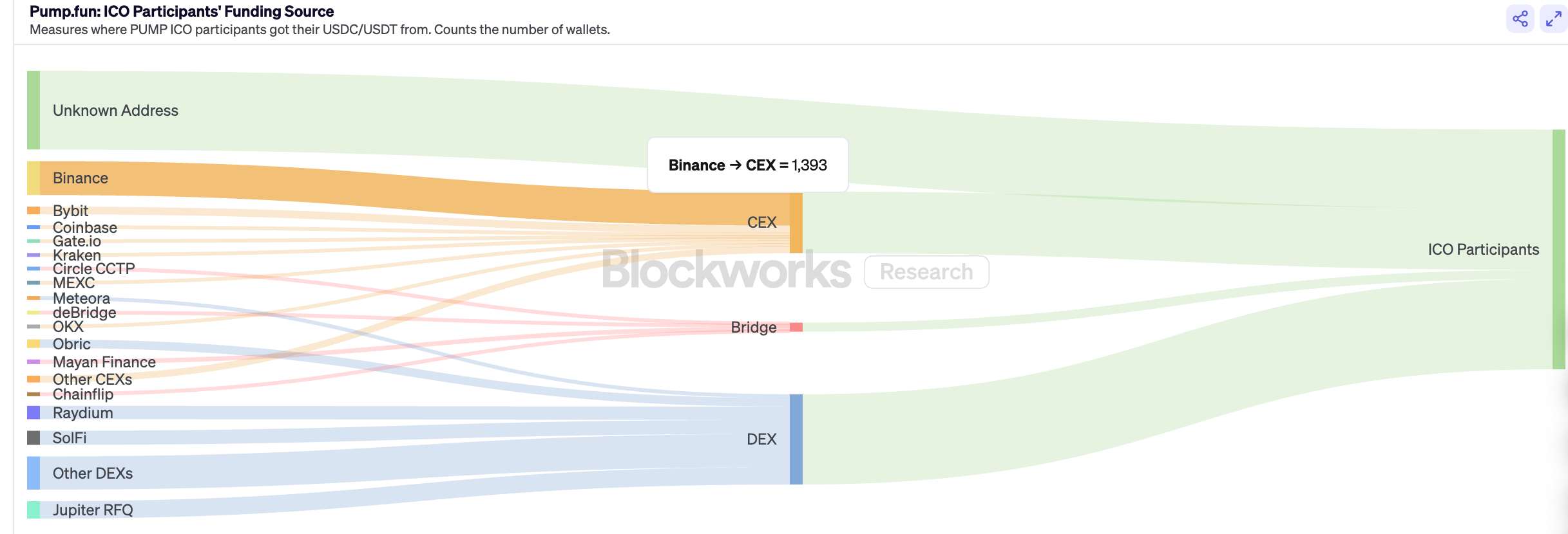 最后,如果考察直接去 Pump 官网参与预售的资金来源,你会发现除了自建的独立地址之外, 大部分的链下资金实际上都是从 Bianance 提出来的,其数量甚至超过了所有其他 CEX 提币地址数的总和。