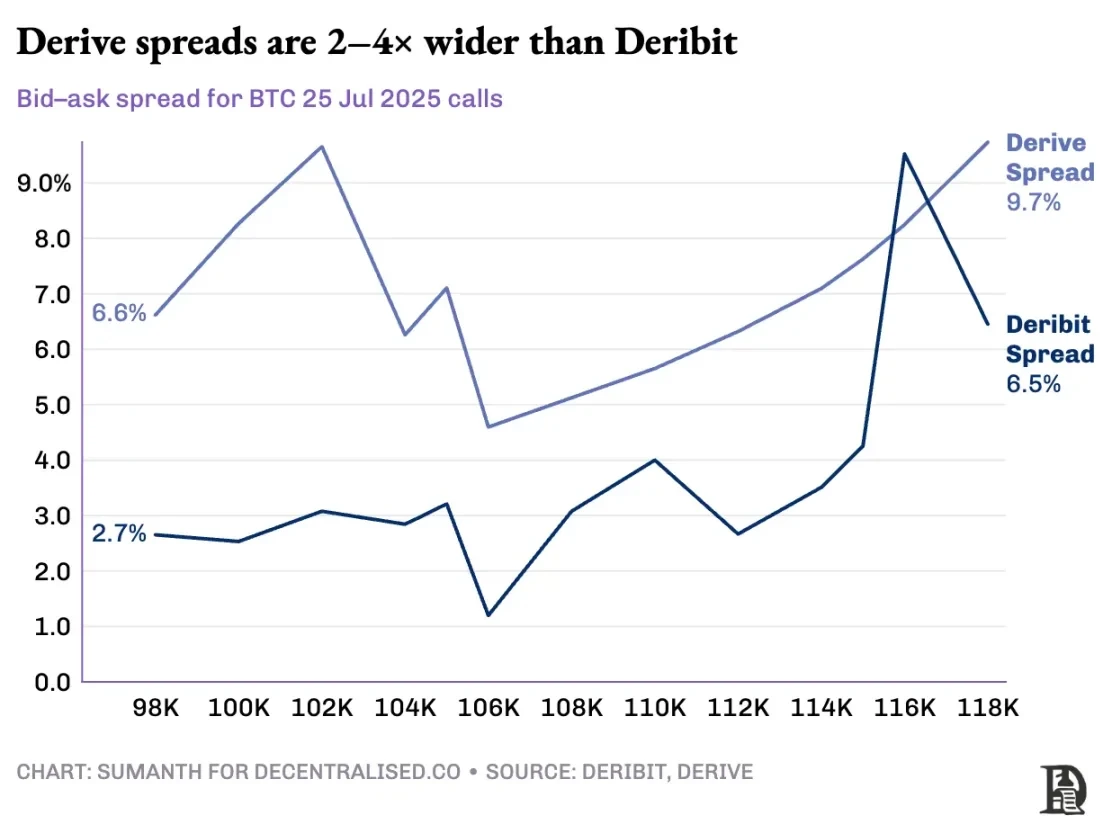 链上协议在将每份行权价和到期日代币化到各自的 ERC-20 代币库中时,就打破了这种循环。下周五铸造的 12 万看涨期权无法识别 BTC 永续合约的对冲。虽然 Derive 已通过在其清算所内添加永续合约来实现跨保证金,部分解决了这个问题,但价差仍然远高于 Deribit;同等仓位的价差通常要高出 2-5 倍。