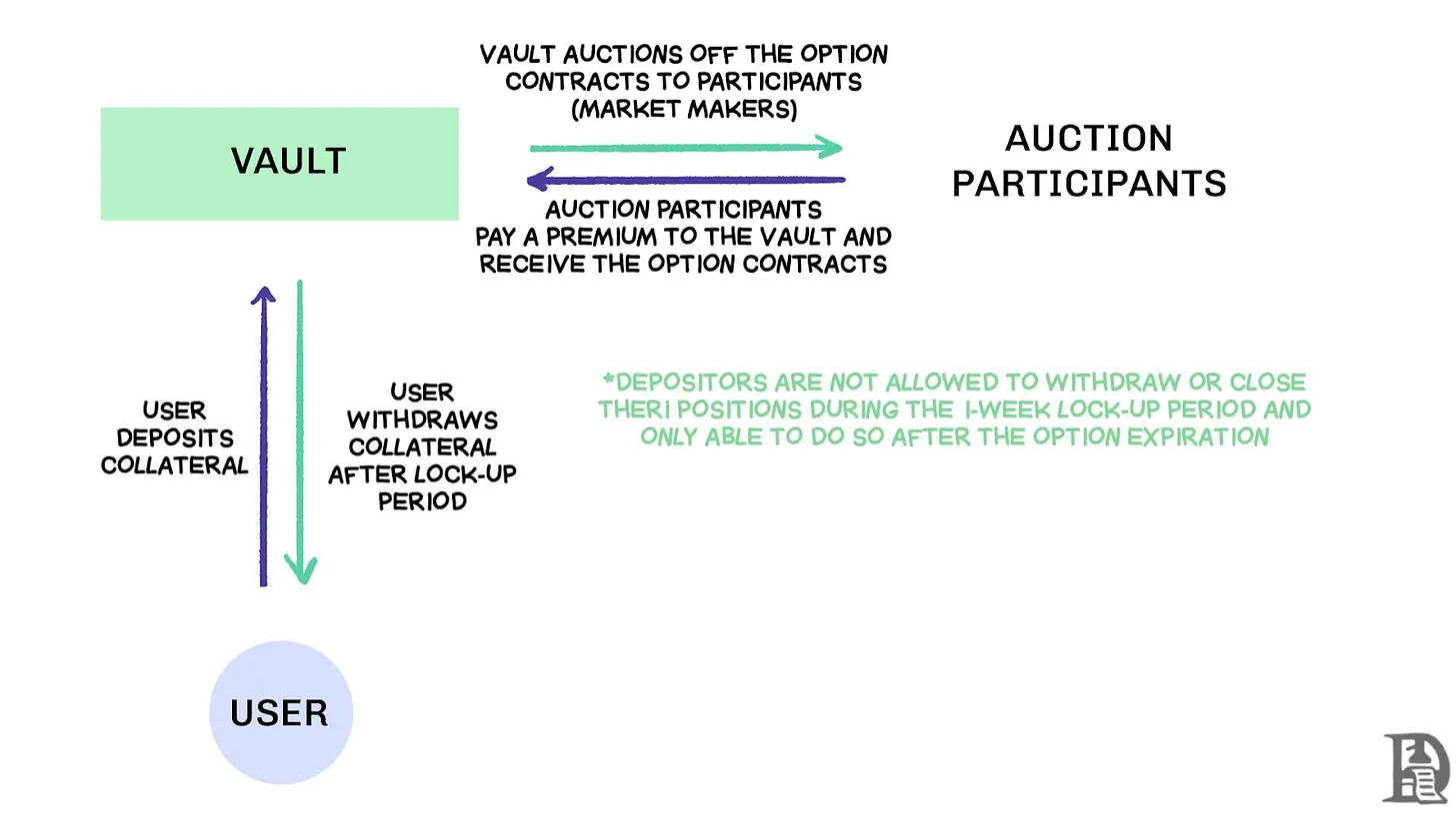 2021 年初,去中心化期权金库(DOVs)出现。Ribbon Finance 开创了这种模式,策略很简单:用户将 ETH 存入金库,每周五通过链下拍卖卖出备兑看涨期权。做市商竞标订单流,权利金作为收益返还给存款人。每周四期权结算、抵押品解锁后,整个流程重置。