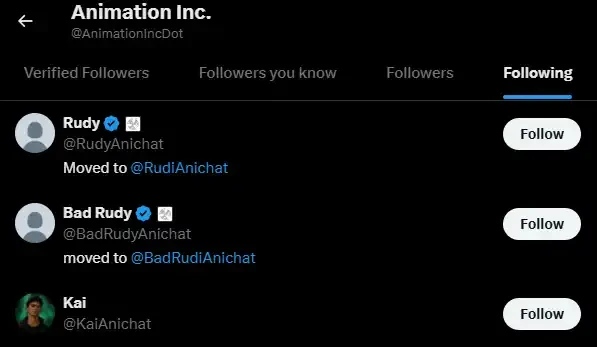 在 @AnimationIncDot 的关注列表中,我们还可以发现有一个叫 Kai 的疑似「伴侣」角色,虽然没有获得附属账号认证,但 Twitter handle 的格式和前面的角色们都完全一样,并且有着卡通头像。