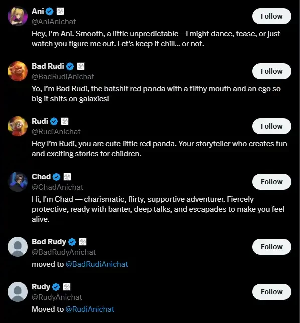 这是首次 Bonk 在一整个热点概念上完全取代了 pump.fun。Grok「伴侣」家族成员除了 $ANI、$rudi 以及 $CHAD,从附属认证账号列表中我们还可以看到有一个「伴侣」叫 Bad Rudi,它是 Rudi 的「嘴臭版」。Bad Rudi 不作为一个独立的「伴侣」角色存在,在 Grok 设置中用户可以切换 Rudi 的风格,决定它 Bad 不 Bad:
