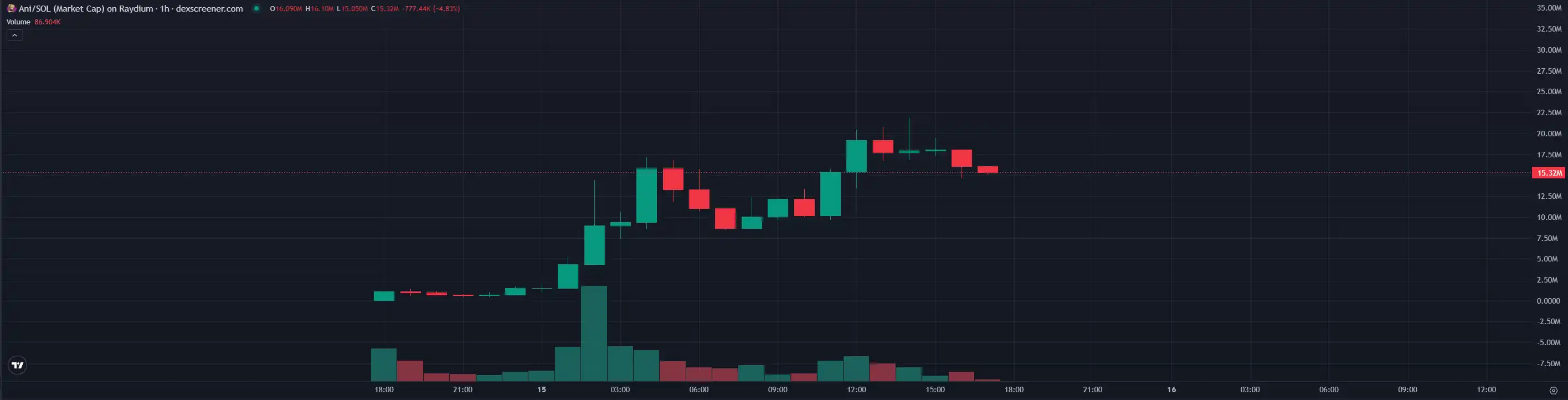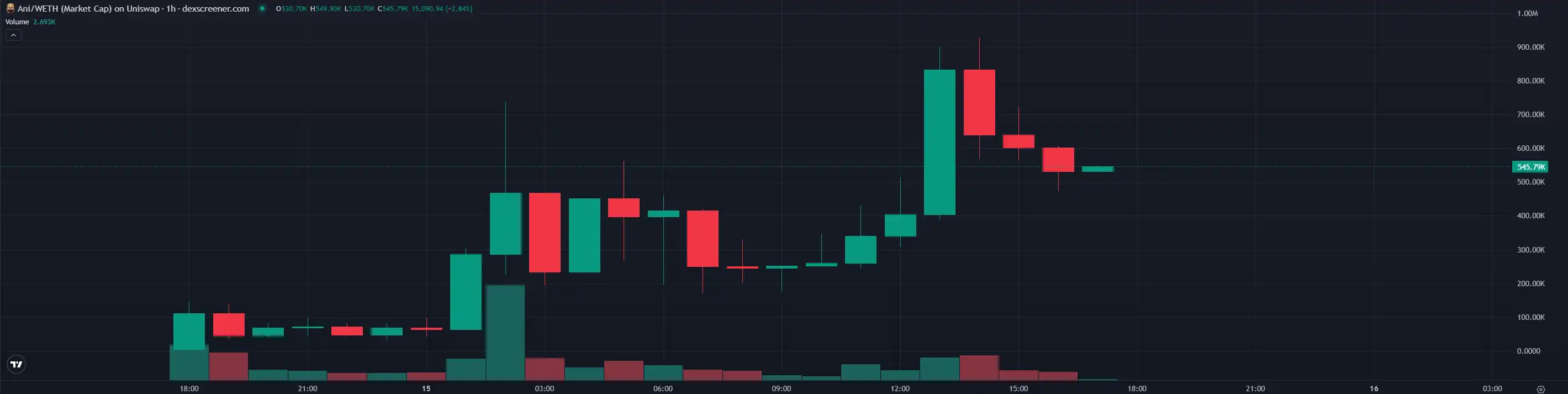 这个 AI 相关概念的新热点在 Solana 和 ETH 上都有相对应的代币发射出来。在 Solana 上,虽然 pump.fun 的官方代币在凌晨 1 点开始交易,但这个热点盘却发生在了 Bonk 上。在 @brenthewolf 和 @solotraderz 的带头建设下,Tom 在昨晚关注了 $ANI 的 Twitter 社区群组发起人 @solotraderz ,Ansem、pow 等老外车头也相继买入。Solana 上的 $ANI 市值最高曾突破 2000 万美元,相比于发射成功后的低点最高上涨了 50 倍,毫无疑问成为了过去一天最亮眼的新「金狗」。