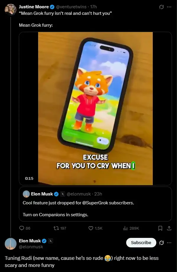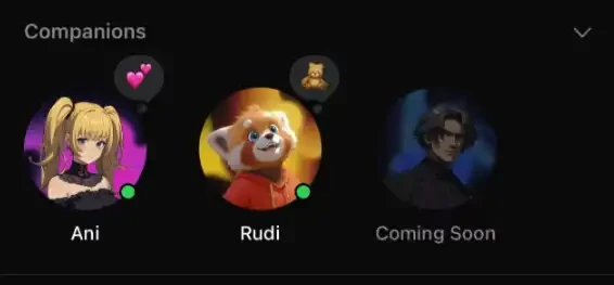 和 Ani 这个形象一同推出的「伴侣」还有一只名为 Rudi 的小熊猫。这只小熊猫的说话风格和女朋友一样温柔的 Ani 不同,Rudi 走的是粗鲁风。