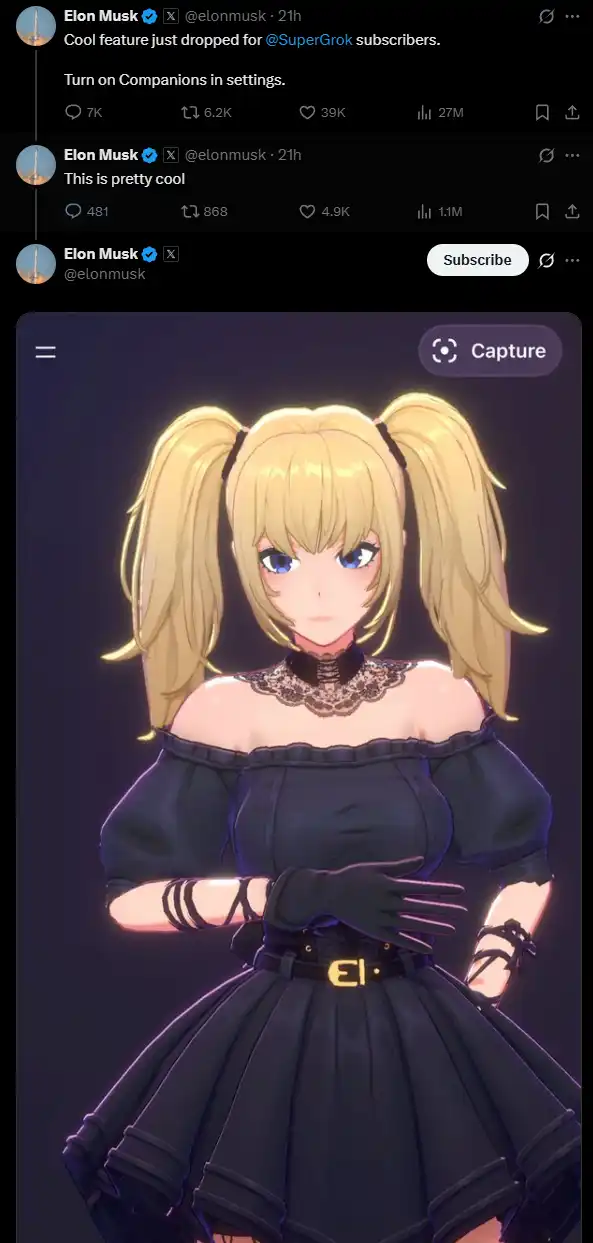 昨天晚上,马斯克宣布 SuperGrok 订阅用户将能够在 Grok 中启用「伴侣」功能。