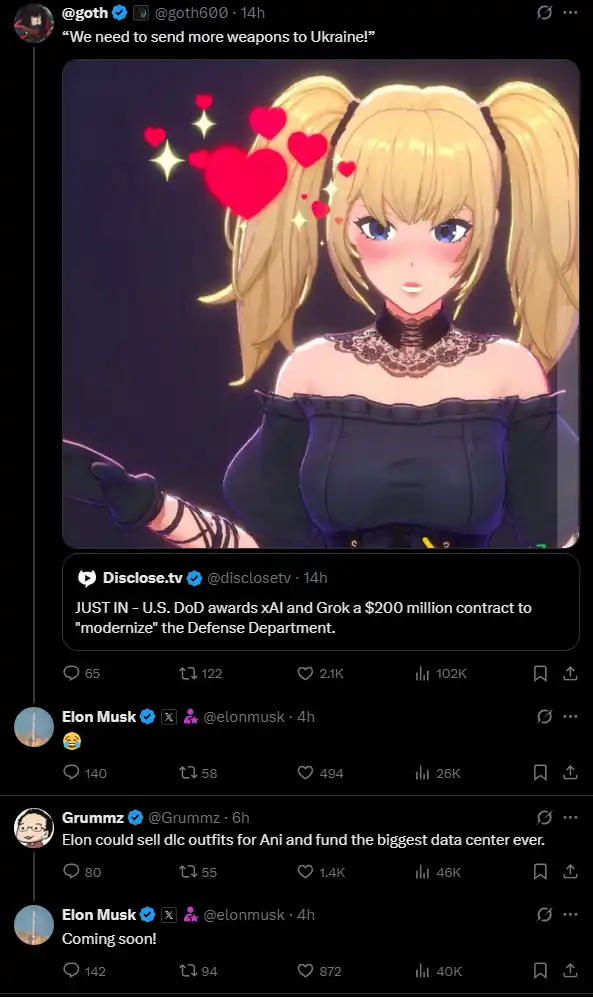 上图的这个金发动漫女郎叫 Ani,老马对她还是挺上心的。直到今天,他都还在交互 Twitter 上关于 Ani 的相关内容: