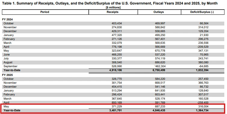 进入 7 月,市场得到的数据显示,美国 仅在 2025 年 5 月单月就录得 3160 亿美元的财政赤字。 这是有史以来第三高的月度赤字水平。起初,由于马斯克对支出法案提出反对,市场还抱有期待。