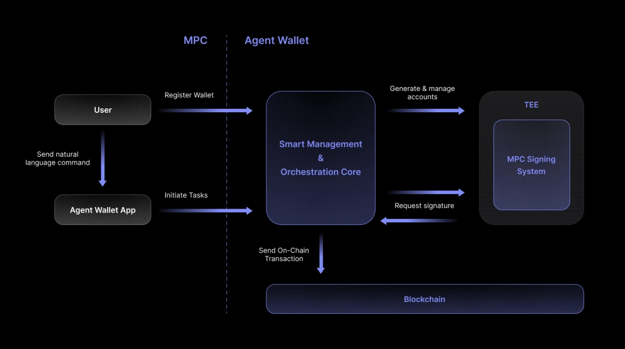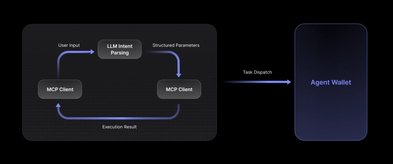 AI Agent Wallet 是 Orcamind 提出的,由可信后端代理的智能钱包 App。经由 MCP 服务与 LLM 连接,用户通过自然语言下达的指令能够在保证资产安全的前提下直接驱动 Agent Wallet 自动执行一系列复杂的链上操作(如转账、合约交互),无需进行繁琐的签名操作,也无需理解区块链底层的技术细节。
