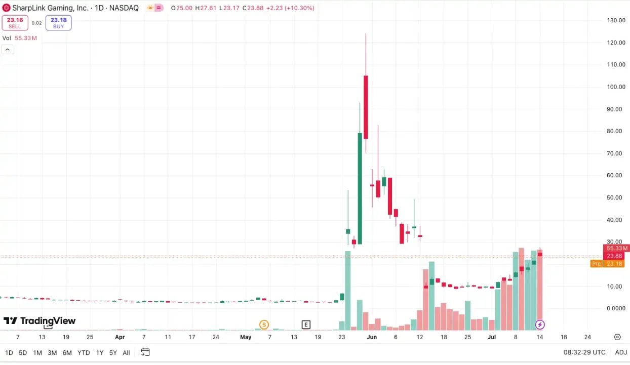 SharpLink (SBET) 作为首家以 ETH 作为战略储备的公司,在宣布购入 ETH 之后,其股价从 3 美元暴涨到 100 美元以上,又跌回个位数,饱受市场诟病,目前股价再次来到 20 美元以上。