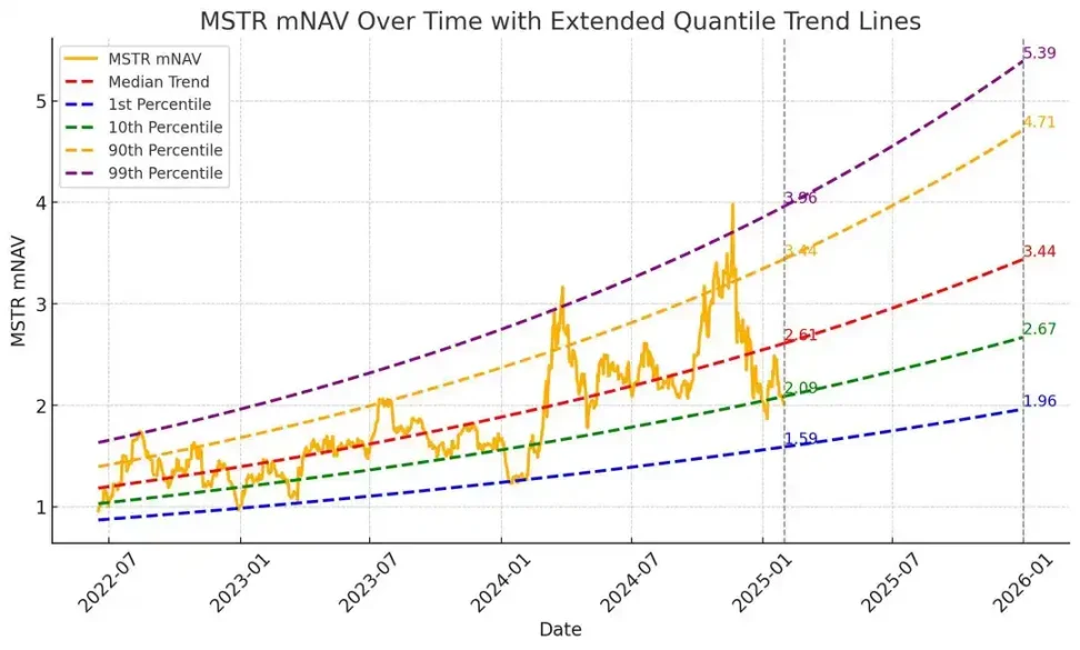 MSTR 的 mNAV 曲线反映出了加密市场的情绪如何主导此类公司的估值。