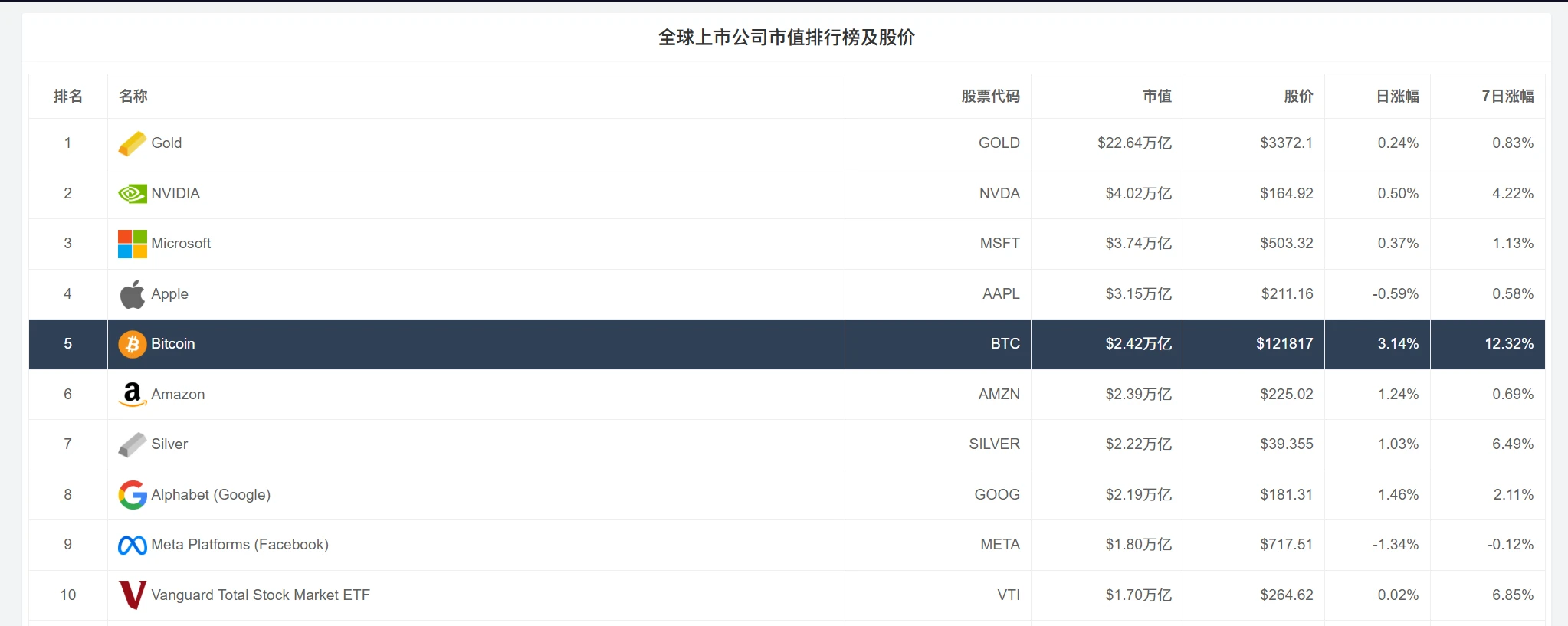 近期比特币创下历史新高,截至撰文时间 7 月 14 日,比特币价格已经突破 12 万美元,市值超 2.4 万亿美元,超过了亚马逊等一众巨头,位列全球资产市值排行第五(BTC 123.FANS, 25 年 7 月 15 日)。这不是一场投机的胜利,而是全球市场对它的重新定价。