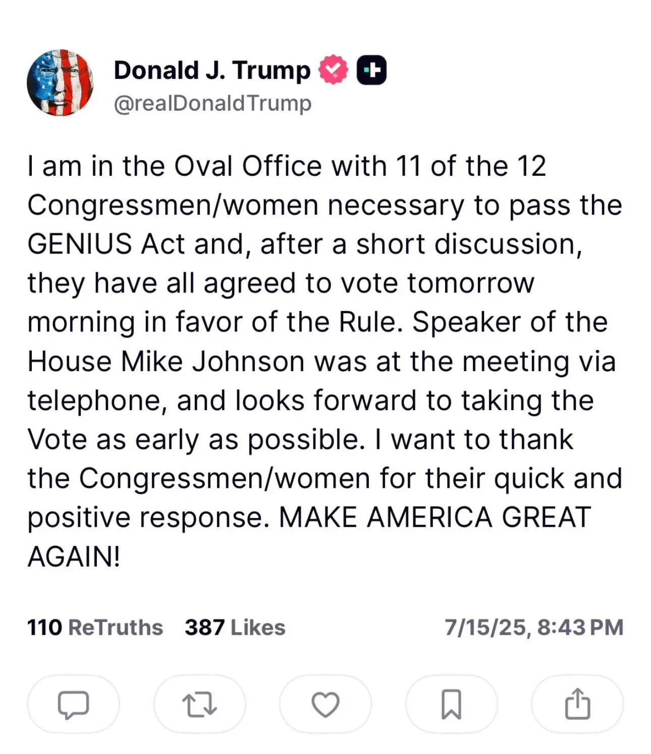美国时间7月15日晚间,特朗普在Truth Social平台发文称将与11名反对的共和党议员会面,称他们已同意在7月16日上午(美国时间)再次投票支持规则条款,美国众议院议长约翰逊称希望周三在众议院再次尝试就加密货币法案进行程序性投票。