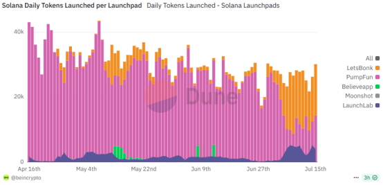 另一方面,市场在萎缩,竞争对手却在崛起。曾经放眼市场无敌手的Pump.fun,最近也遇到了压力。就在最近,以BONK为主体的对手letsbonk.fun发展迅速,期间多次在代币发射数量中占据首位,力压Pump.fun登上了市占率第一,尽管Pump.fun迅速反击,但两者竞争仍焦灼不断,不得不承认,Pump.fun龙一的地位受到了威胁。