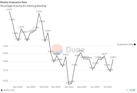 更为关键的是,今时不同往日往日。从市场来看,纵观如今的币圈,除了这两日龙抬头外,大多数山寨币与MEME币的走势只能以低迷论之。此点从交易量就可一窥究竟,根据Dune的数据,在2025年1月23日达到544万美元交易量峰值后,Pump.fun交易量基本呈现断崖式下跌趋势,近日的日交易量基本稳定在70万美元以内,据高点跌幅87.2%,而从代币创建来看,单日代币创建从7万的峰值降到3万,几乎腰斩。代币毕业率更是低的惊人,在2024年还有曾有1.6%的毕业率,但来到如今,毕业率已然低至1%以内。足以看出,造福效应减弱,MEME市场正在变“冷”,用户的热情也正在快速消退.然而,Pump.fun如何厉害,也仅仅是一个工具,需要背靠MEME市场热度,这也让市场对其估值产生了质疑。