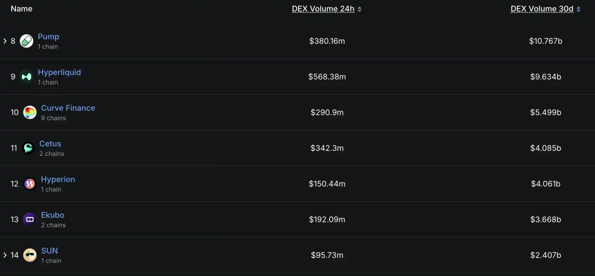 根据 DefiLlama 数据,Hyperion 过去 30 天总交易量超 40 亿美元,在所有 DEX 中排名第 12 。