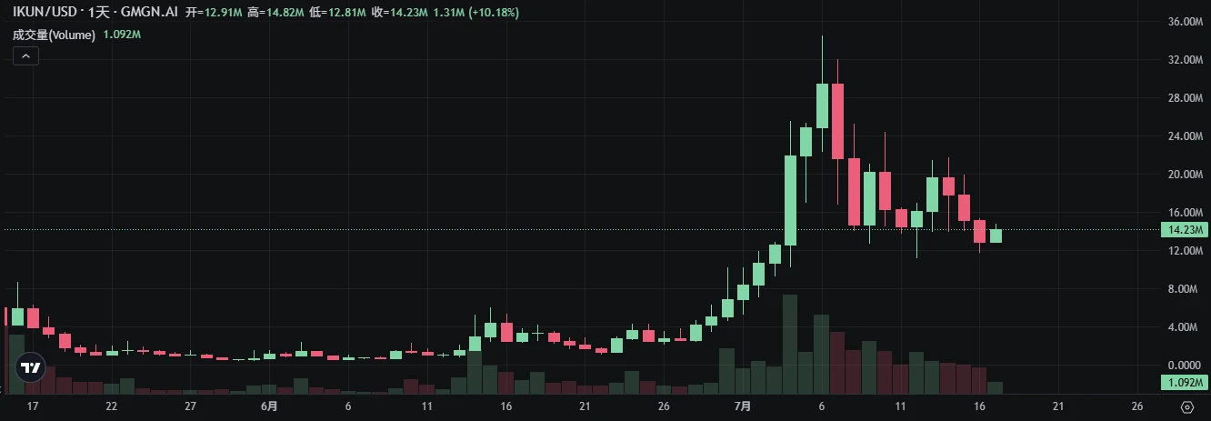 价格表现: 据 GMGN 数据 ,IKUN 市值自 6 月初触及 3500 万美元后持续下跌,目前市值为 1400 万美元。