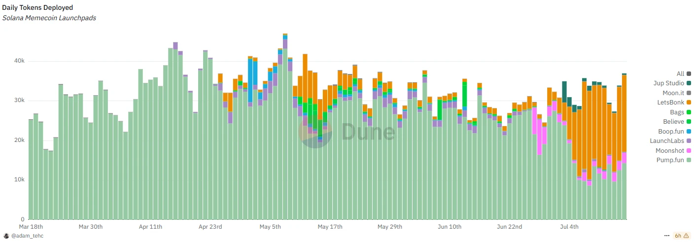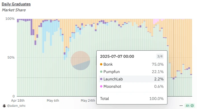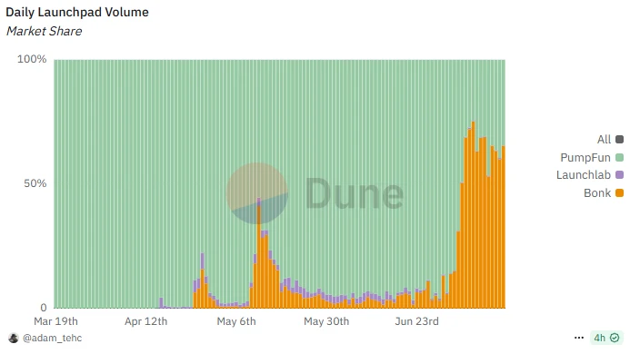 再者是每日交易量占比。 自 7 月 5 日超过 Pump.fun 起,Letsbonk.fun 每日交易量占比维持在 55% 至 75% 区间波动。