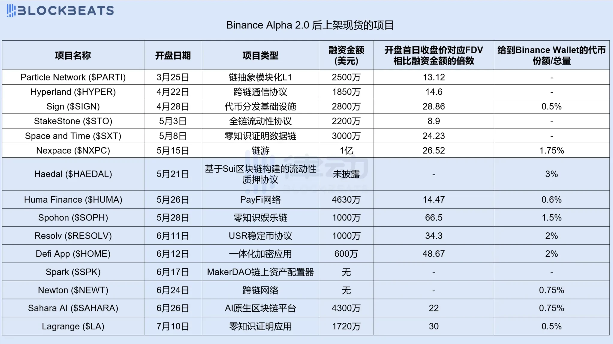 这些项目不但是「正规军」,而且是「崭新的正规军」——都是 TGE、开放空投申领然后差不多同时上线 Binance 现货的。例外的是 Lagrange,在上线 Binance Alpha 和 TGE 一个多月后才上架 Binance 现货。单纯从这些项目和 Binance Alpha 空投活动的关联来看,有 10 个项目做了「积分空投」。而这 10 个项目给到 Binance Wallet 的代币份额也各有不同,最多的是 Haedal,给到的代币份额占其总量的 3%,最少的是 Sign 和 Lagrange,给到的代币份额占其总量的 0.5%。
