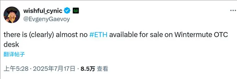 Wintermute 创始人兼首席执行官 Evgeny Gaevoy 于 7.17 日发文表示,其 OTC 交易平台上已几乎没有 ETH 可供出售