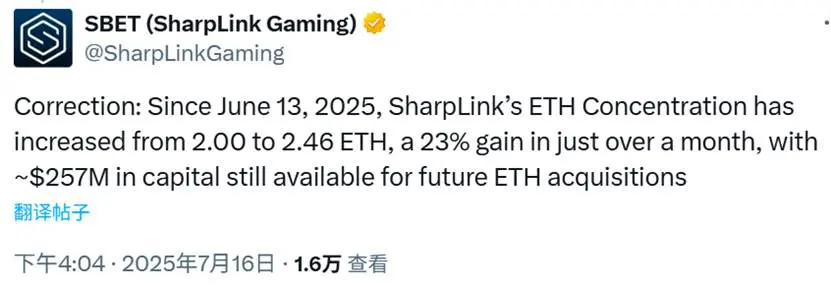 SharpLink Gaming (SBET) 持有 280,706 枚 ETH ,其中 99.7% 在质押中产生收益。一个月内 ETH 持仓增长 23% ,目前有约 2.57 亿美元资金用于继续购买以太坊。