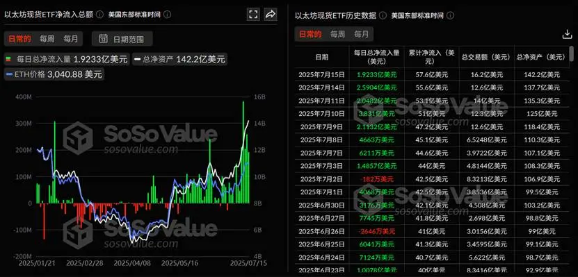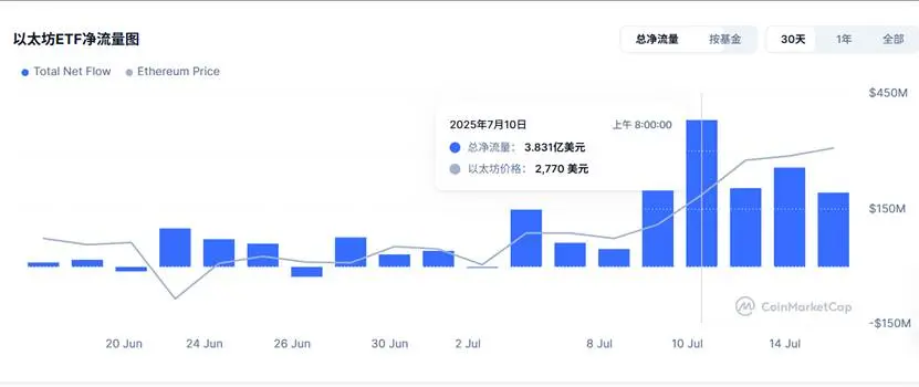 以太坊的表现更为引人注目。仅 7 月 10 日一天,美国以太坊现货 ETF 总净流入 3.83 亿美元,其中贝莱德 ETHA 贡献 3.009 亿美元,其次为富达。截至发稿前,所有 ETF 管理的资产规模已达 142.2 亿美元,占 ETH 总市值的 3.87% 。历史累计净流入已达 57.57 亿美元。