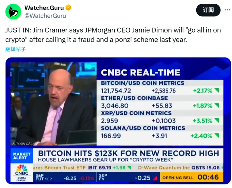 更戏剧性的信号来自摩根大通。据 CNBC 主持人 Jim Cramer 透露,曾经称比特币为 " 欺诈 " 的摩根大通 CEO Jamie Dimon ,现在将 " 全力拥抱加密货币 " 。这种态度转变比任何数据都更能说明问题。