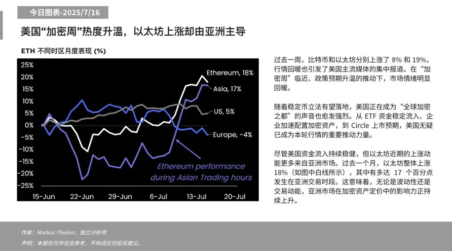 Matrixport 研究显示,以太坊 7 月涨幅 18% ,源于“加密周”临近和政策预期。企业配置和 Circle 上市预期成为主导力量。升温其中 17 个百分点来自亚洲交易时段。