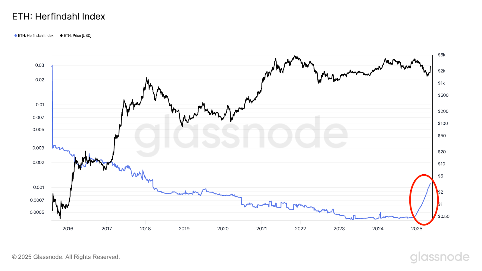 然而链上的数据,却早有预兆——2024 年 12 月至 2025 年 4 月,是以太坊价格自由落体的阶段,但也是赫芬达尔-赫希曼指数(HHI)悄然拐头向上的时刻。