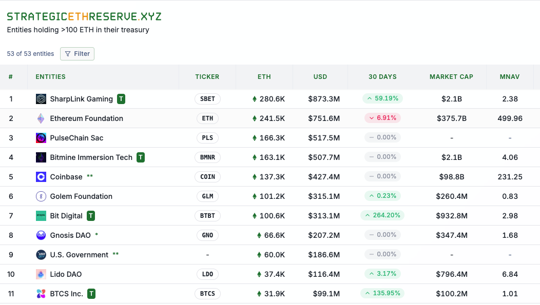 根据 Strategic ETH Reserve 的数据,在以太坊前 11 的机构持仓中,已有 4 家是以太坊战略储备公司。