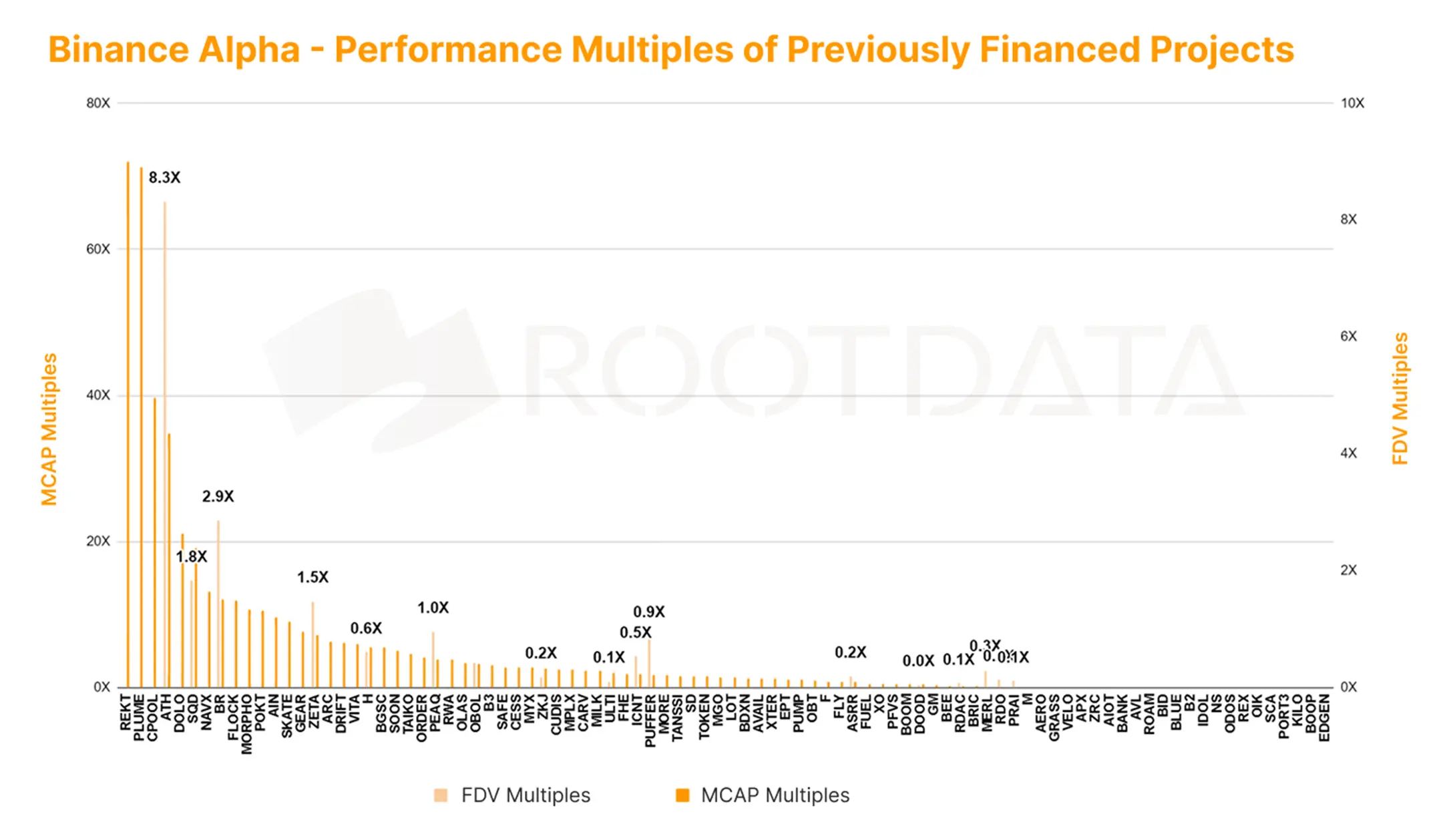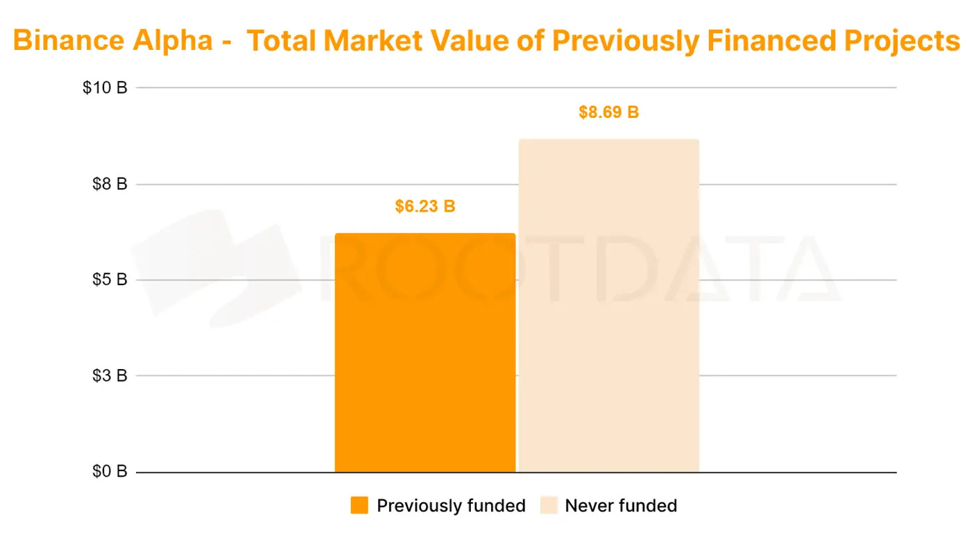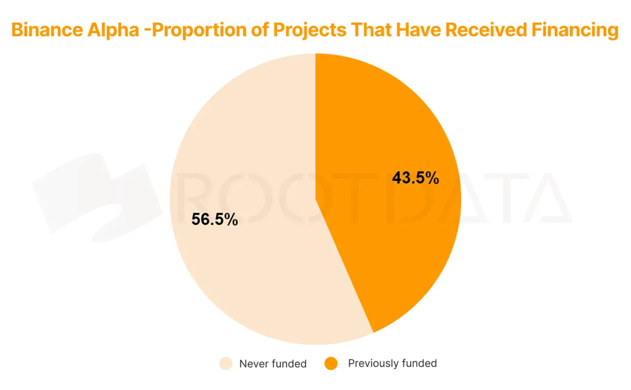 Binance Alpha上线的代币中, 未曾公布融资的项目占据56.5% ,未曾融资项目的总市值高达86.9亿美元,而曾获得融资的项目总市值仅62.3亿美元。