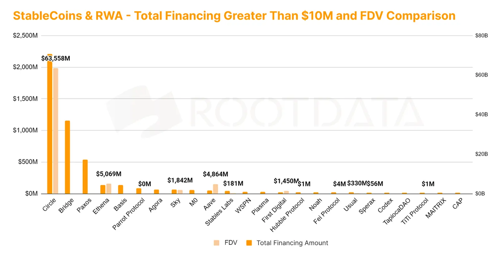 据Roodata数据统计显示,目前融资金额于Circle稳定币概念相当的是Bridge, Paxos及Ethena, 其中DeFi应用之一RWA和算法稳定币相较有华尔街资金支持的Circle估值严重低估。