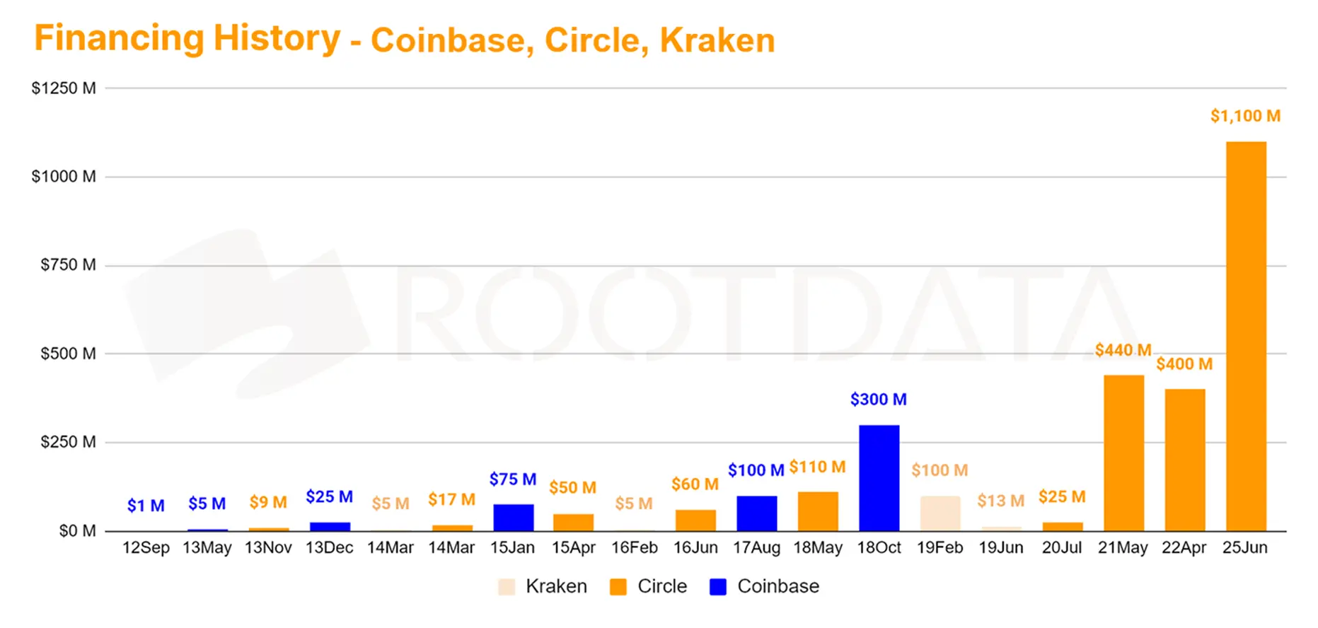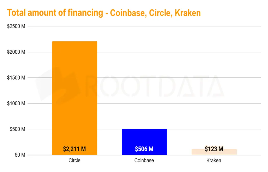 Circle是IPO项目中融资金额最高的项目,达到22亿美元,而相较之下Coinbase和Kraken仅融资5亿美元和1.2亿美元,其美股大额融资的时间节奏为1-2年。