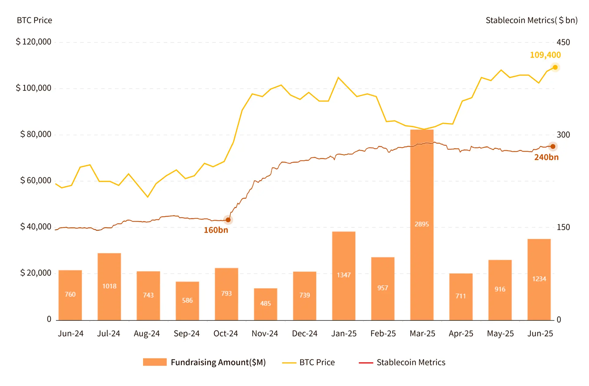 稳定币市场自2024年10月底起显著扩张,总市值从1600亿美元快速增至2400亿美元,增长50%。同期,BTC价格自68000美元低点攀升至105000美元,且年内未回落到稳定币拉升前的区间。 稳定币与BTC的联动上涨为一级融资提供了流动性支持,尤其推动了CeFi领域的大额交易。