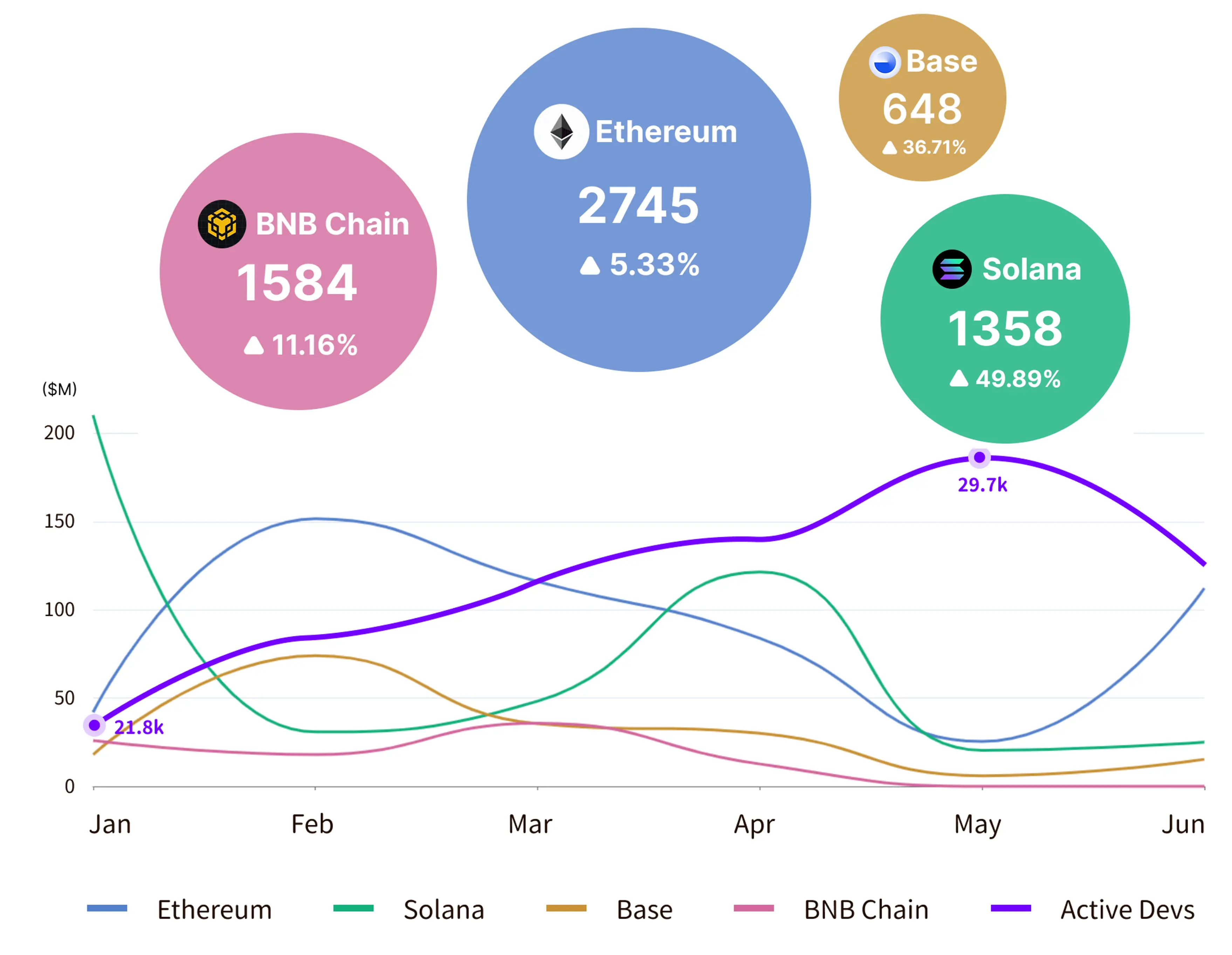 加密基金对公链和应用的推动力减弱,融资额与应用生态增长显著背离。 上半年一级市场资金向CeFi赛道集中,主流公链融资额普遍低迷且呈下行趋势, 但应用开发未受明显拖累。 根据developerreport数据,每月活跃开发者在今年1月跌至约2.18万,创下近4年低点,年中已反弹到2.97万高位, 社区驱动的技术创新正在弥补融资缺口。