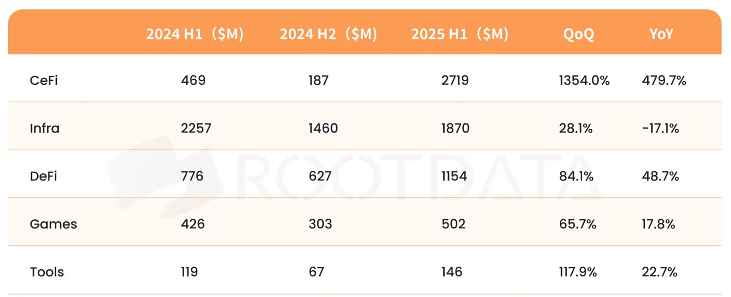 赛道表现分化明显,投资热点趋向于合规化和多元化。 CeFi以27.19亿美元融资额领跑,同比激增479.7%,环比暴涨1354%,重夺龙头地位。基础设施赛道融资18.7亿美元,环比下降17.1%。DeFi和工具赛道分别吸金同比增长84.1%和117.9%。