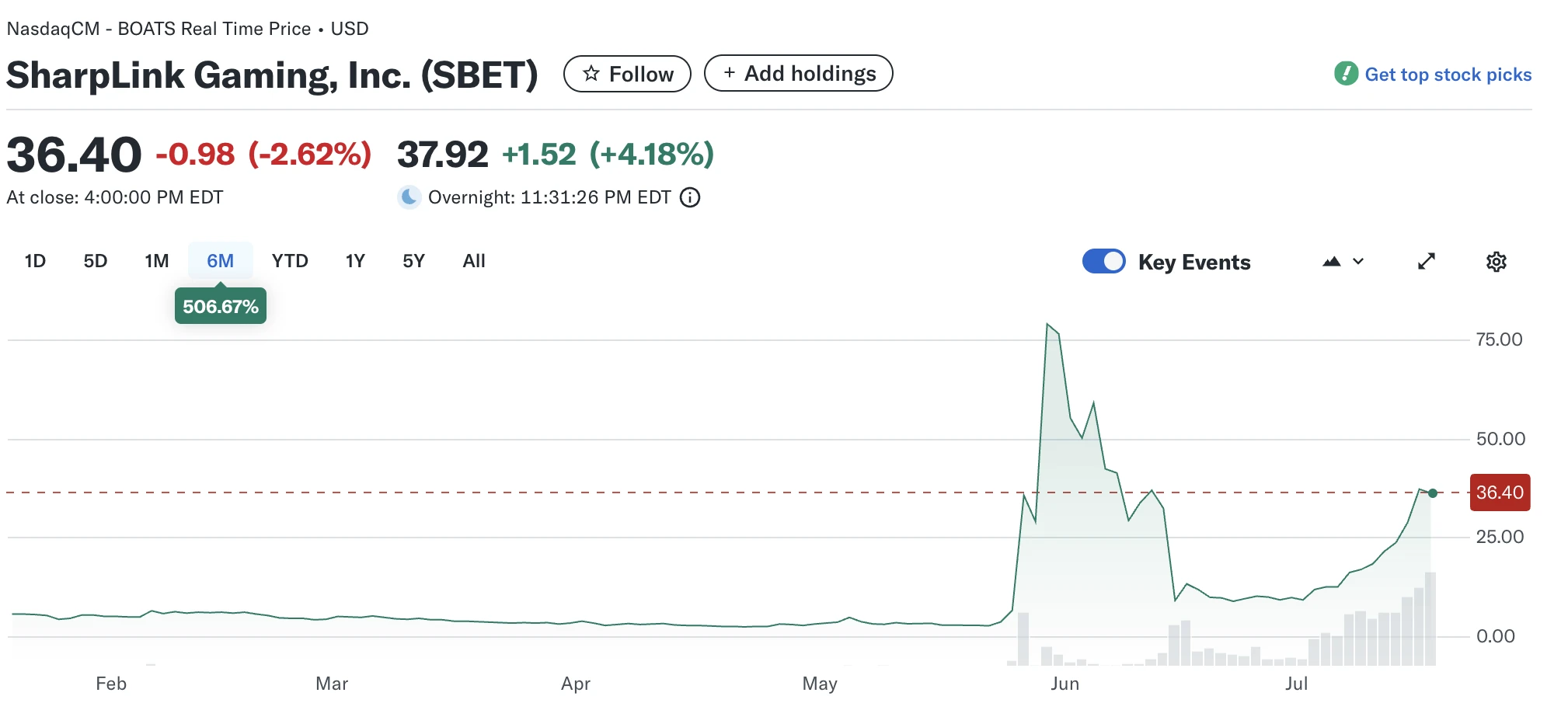 自年初的 300 美元一路涨至如今高达 458 美元的盘后价,年度涨幅高达 55.84% ,市值暂报 1268 亿美元;而 Sharplink(SBET)股价则从年初的 8 美元左右涨至现在的 36 美元左右,年度涨幅约为 374% 。