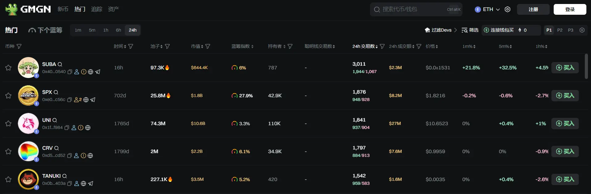 过去 24h 以太坊热门代币前五依次为:SUBA、SPX、UNI、CRV、TANUKI