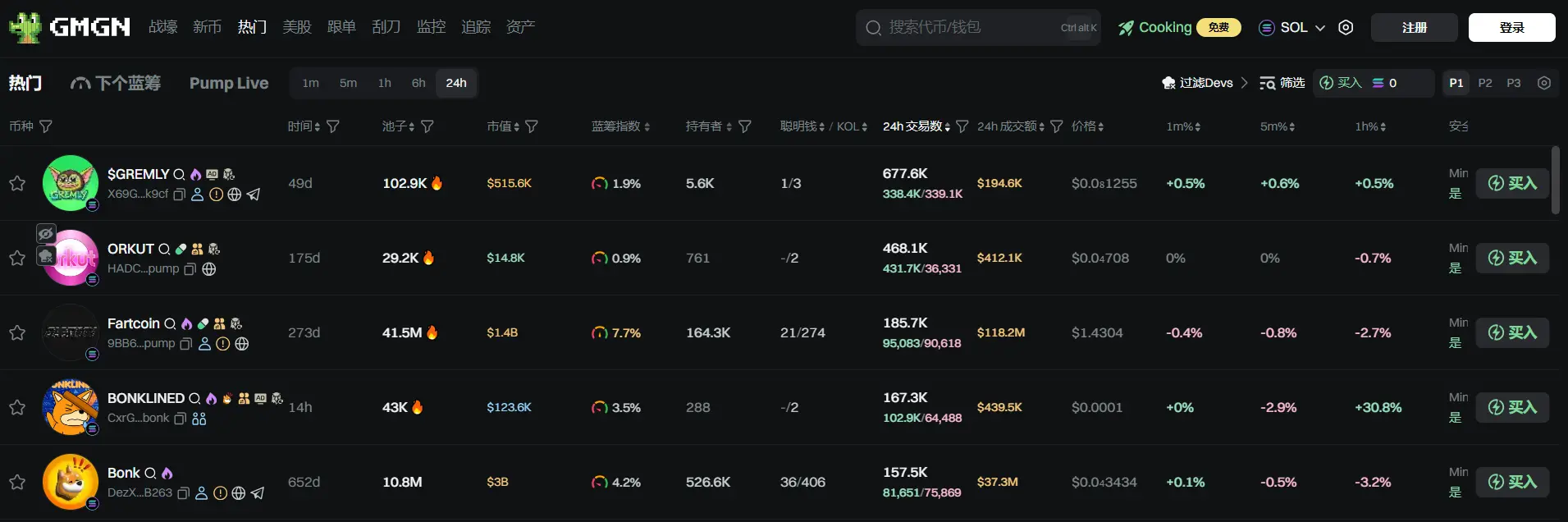 过去 24h Solana 热门代币前五依次为:$GREMLY、ORKUT、Fartcoin、BONKLINED、Bonk