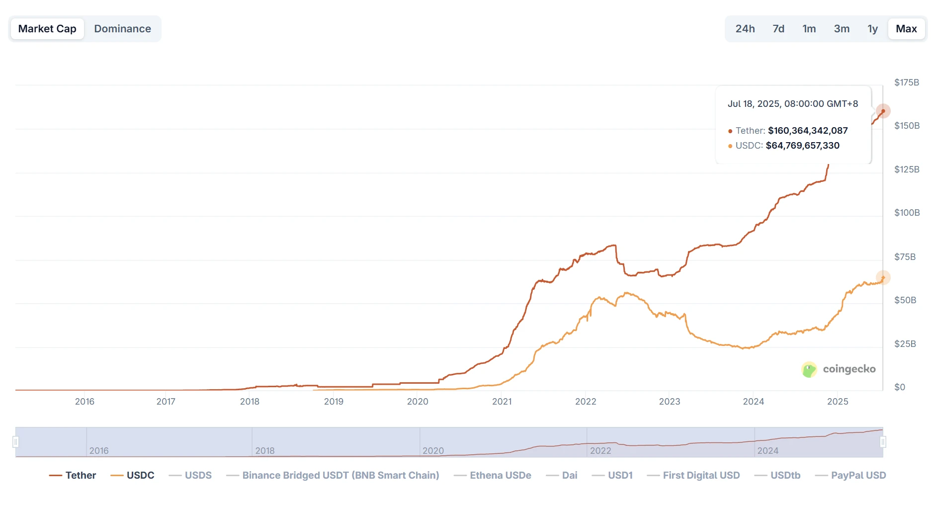 而从整体规模看, 2025 年以来,稳定币仍保持增长态势—— 根据 CoinGecko 数据,截至 7 月 18 日,全网稳定币总市值约为 2620 亿美元,相比年初增长超过 20% 。