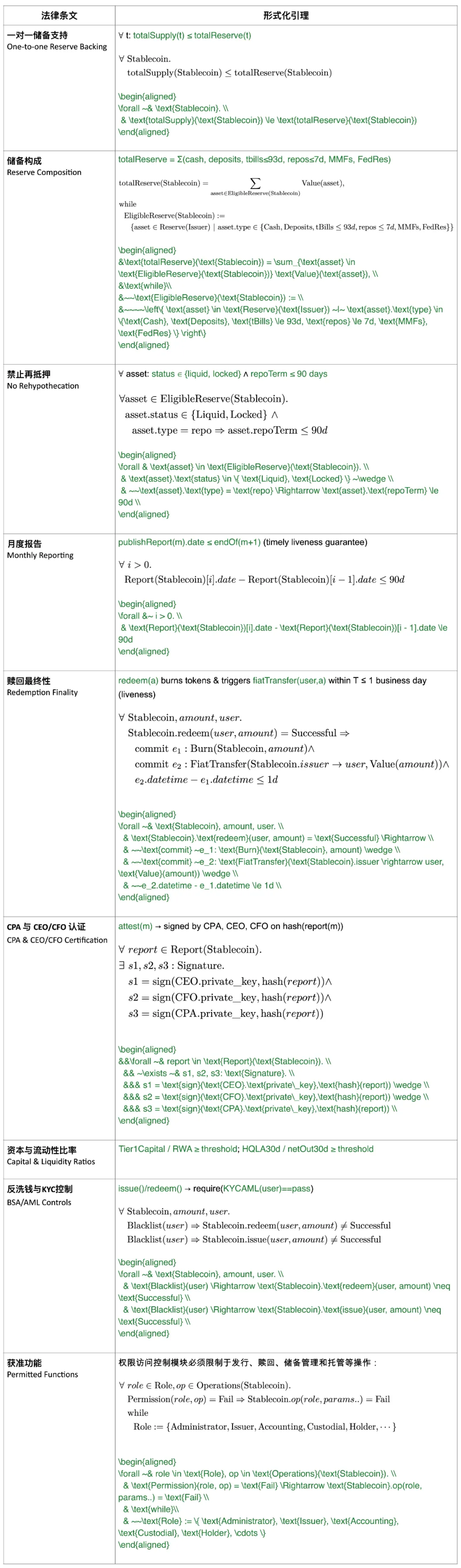 形式化验证将每个合规要求表达为链上的不变式(Invariant)或活性(Liveness)。以《GENIUS 法案》为例,上述法律条文可形式化表达为以下引理: