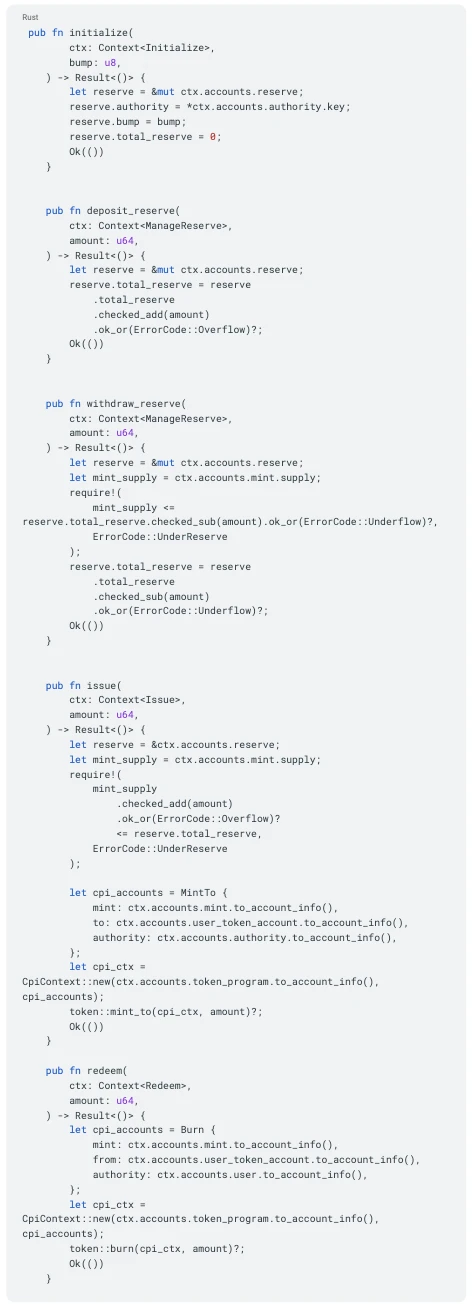 以下是 Solana 稳定币程序示例的精简版本,用于展示如何在链上强制执行核心不变式:
