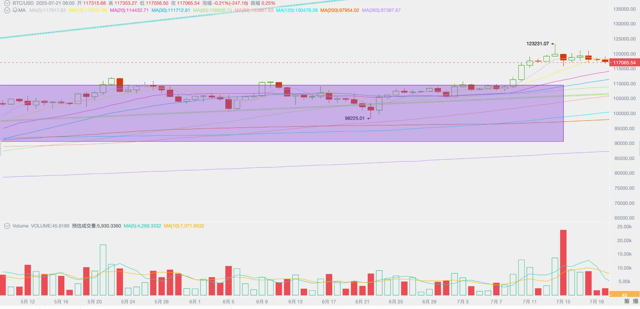 BTC 本周开于 119130.81 美元,收于 117312.70 美元,下跌 1.53% ,最高 123231.07 美元,最低 115697.美元,振幅 6.32% ,成交量明显放大。