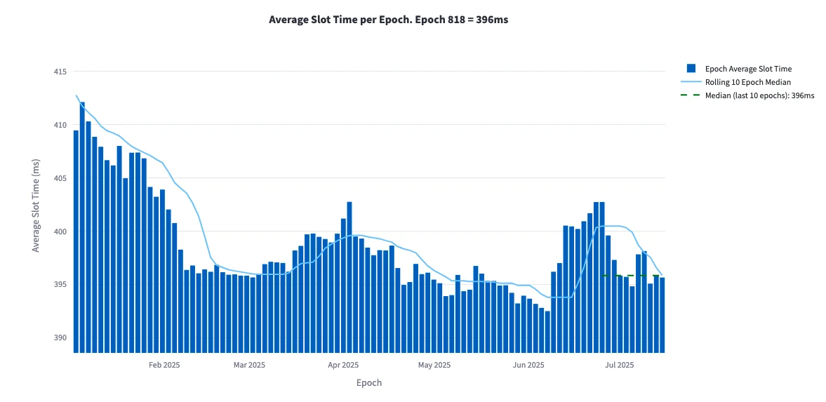 随着 Solana 的代码问题在过去几年中逐步得到解决,区块时间(即网络生成新交易区块所需的时间)显著减少,甚至低于其标称的 400 毫秒。